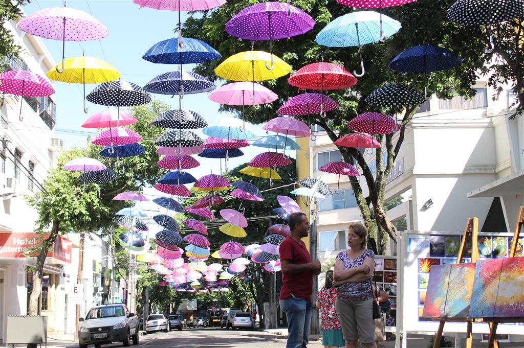 Se a última quinta-feira (29) foi de sol forte em Cianorte, na Rua Piratininga choveu cultura. Quem passou pelo local foi surpreendido por uma estrutura de guarda-chuvas de diferentes cores, suspensos, que serviram como teto para diferentes expressões e manifestações artísticas, entre elas música, exposição de artes, flores e fotografias, além de atividades circenses. A programação durou todo o dia e envolveu pessoas de diferentes idades e estilos.