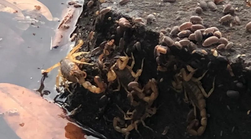 Na imagem, é possível ver vários escorpiões, grandes e pequenos, espalhados tentando fugir da água no meio do mato e de lixos amontoados.