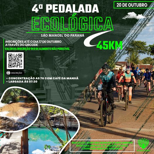 No próximo dia 20, São Manoel do Paraná será palco da 4ª Pedalada Ecológica, evento que já se tornou tradição na cidade e atrai ciclistas de toda a região. A concentração será na Praça Paraná, às 7h, onde os participantes serão recebidos com um café da manhã antes de enfrentar o percurso de 45 km até a Reserva Ecológica Caraguatatiba.