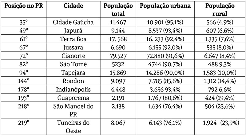 Cidade Gaúcha aparece no topo, com 95,1% de sua população residindo em áreas urbanas, seguida por Japurá (93,4%), Terra Boa (92,4%), Jussara (92%), São Tomé (90,7%), Tapejara (90%), Rondon (85,6%), Indianópolis (93,4%), Guaporema (80,6%), São Manoel do Paraná (76,4%) e Tuneiras do Oeste (76,1%).
