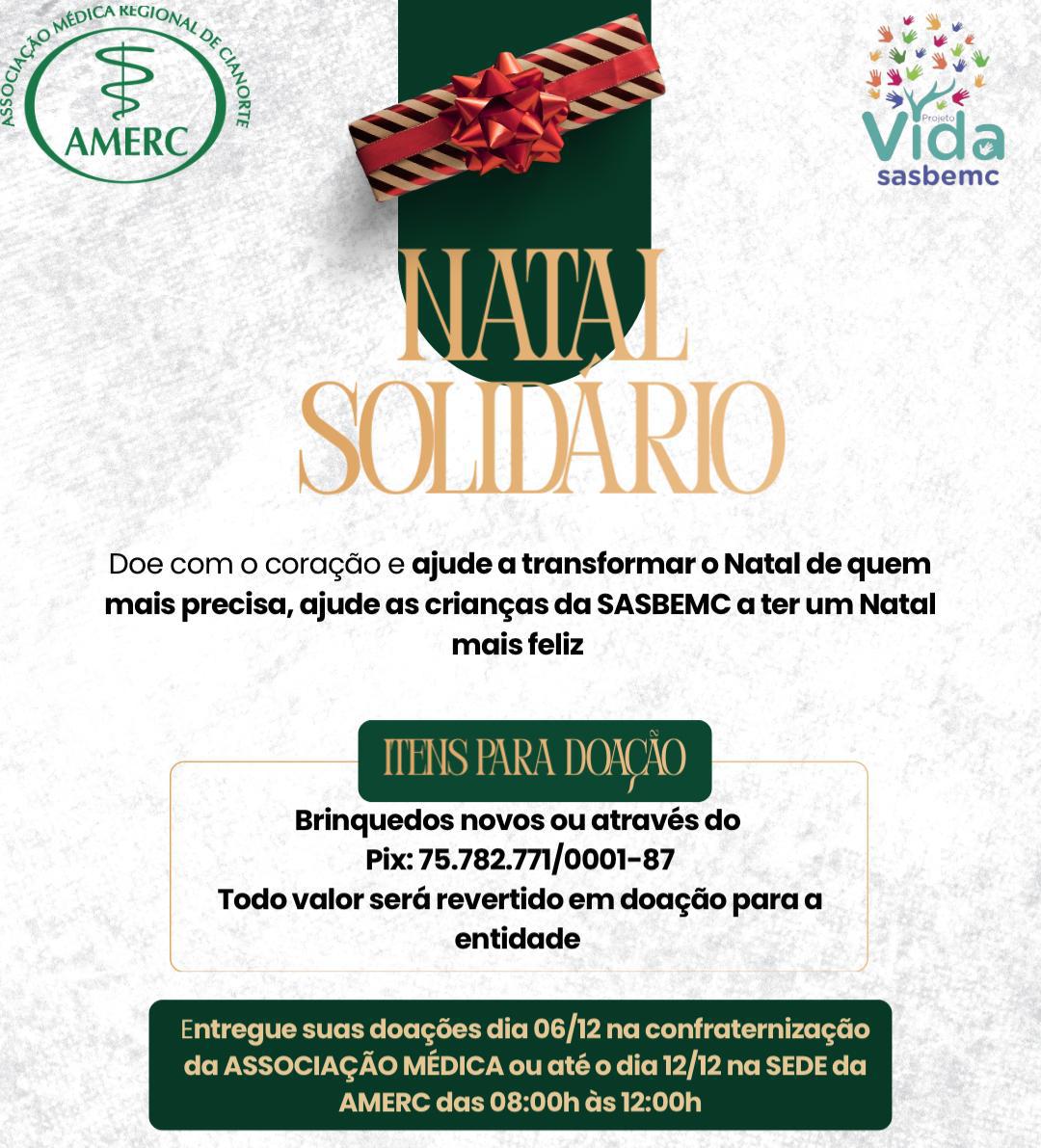 A Associação Médica Regional de Cianorte (Amerc) iniciou a campanha Natal Solidário, ação anual que busca mobilizar a comunidade para ajudar as crianças atendidas pela Sociedade de Assistência Social Beneficente Educacional e Maternal de Cianorte (SASBEMC). A iniciativa pretende garantir um Natal mais alegre às famílias atendidas pela entidade, que desenvolve trabalhos sociais no município.