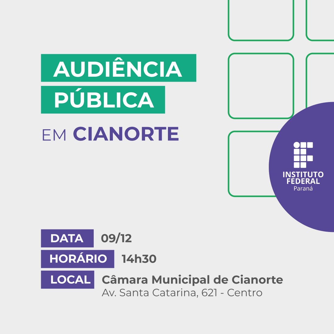 Cianorte será palco de uma importante audiência pública para debater a instalação de novos campi do Instituto Federal do Paraná (IFPR) no estado. O evento acontece no próximo sábado, 9, na câmara municipal, localizada na avenida Santa Catarina, 621 – Centro, começa às 14h30 e é aberto a toda a comunidade.