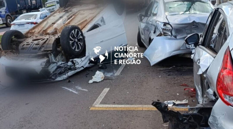 Carro capota após bater em veículos na Avenida Paraíba, em Cianorte