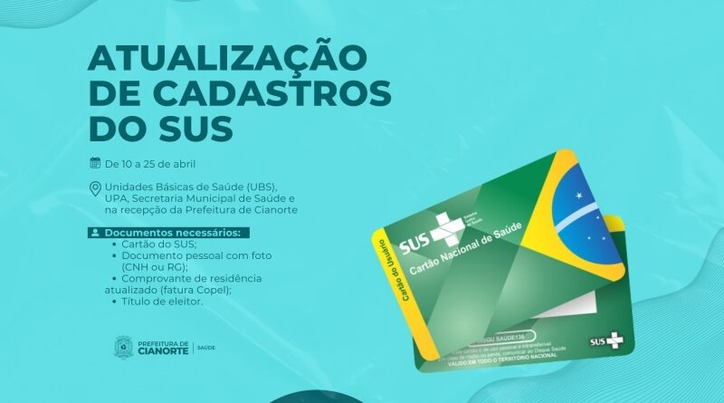 A partir desta segunda-feira, 10, os cianortenses que necessitarem de atendimento pelo Sistema Único de Saúde (SUS), como na UPA ou nas Unidades Básicas de Saúde (UBS), devem apresentar o Cartão do SUS; um documento pessoal com foto (CNH ou RG); comprovante de residência atualizado (com menos de 30 dias de emissão, preferencialmente a fatura de energia elétrica); e o título de eleitor. A medida visa atualizar os cadastros, tanto do cartão nacional quanto do municipal, eliminando inconsistências nos dados e, consequentemente, assegurando mais precisão com relação aos usuários.