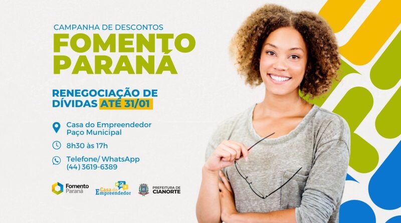 A Secretaria de Desenvolvimento Econômico de Cianorte informa que está em vigor a campanha especial da Fomento Paraná para renegociação de débitos. Empresários e empreendedores locais têm até o dia 31 de janeiro para aproveitar as condições facilitadas e regularizar suas pendências financeiras.