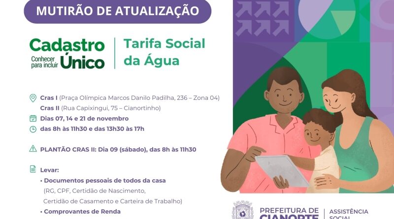 A pessoa ou família cuja atualização ou inscrição no Cadastro Único (CadÚnico) e Tarifa Social da Água (Programa Água Solidária) é igual ou superior a dois anos terá uma oportunidade para regularizar sua situação. Trata-se do mutirão de atualização promovido pela Secretaria Municipal de Assistência Social. Em Cianorte, dos 8.913 cadastros, 2515 precisam ser atualizados.