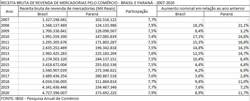 A receita do comércio estadual representou 7,9% do total nacional no citado exercício, o maior referencial desde 2008. No ano de 2007, início da série disponível de resultados, o Paraná respondia por 7,7% da receita do comércio brasileiro, ocupando o quarto lugar entre as Unidades da Federação, sendo superado, além de São Paulo e Minas Gerais, também pelo Rio de Janeiro.