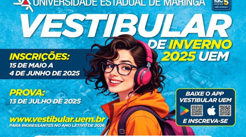 As inscrições para o Vestibular de Inverno 2025 da Universidade Estadual de Maringá (UEM) terminam às 23h59 de quarta-feira (4) e não serão prorrogadas. Os interessados precisam acessar o site www.vestibular.uem.br e preencher o formulário. No endereço, também é possível acessar o edital com todas as informações necessárias e as principais datas.