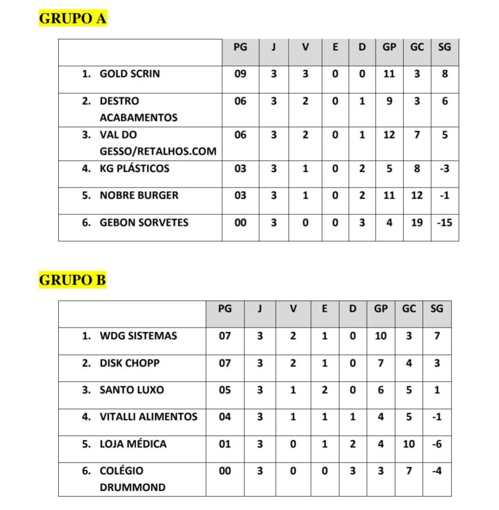 Às 08h30, o duelo será entre Santo Luxo e WDG Sistemas, pelo Grupo B. Pela mesma chave,nNa sequência, às 09h30, duelam Alimentos Vitalli e Disk Chopp Cianorte. Por fim, às 10h30, pelo Grupo A, jogam Val do Gesso/Retalhos.com e Gebon Sorvetes.