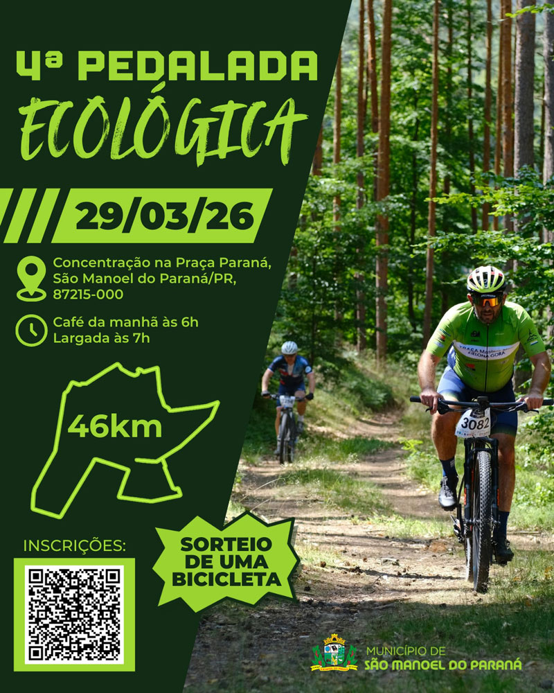 A Prefeitura de São Manoel do Paraná realiza no dia 29 de março a 4ª edição da Pedalada Ecológica. O evento é promovido pela Secretaria Municipal de Meio Ambiente, Sustentabilidade, Turismo e Cultura, com apoio das demais secretarias, e convida a comunidade para um percurso de aproximadamente 46 quilômetros por estradas e paisagens do município.