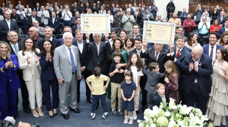 Os médicos Marco Antônio Caron e Pedro Ernesto Caron receberam o título de Cidadão Honorário do Paraná, na noite desta segunda-feira (06), em sessão solene no Plenário da Assembleia Legislativa. A homenagem, repleta de autoridades, amigos e familiares, foi proposta pelos deputados Maria Victoria (PP), Cristina Silvestri (PP), Alexandre Curi (PSD), Delegado Jacovós (PL) e Ademar Traiano (PSD). O reconhecimento celebra a trajetória profissional e o legado de dois nomes fundamentais para a saúde pública do Estado, responsáveis por transformar o Hospital Angelina Caron em um complexo hospitalar de alta complexidade e referência nacional.