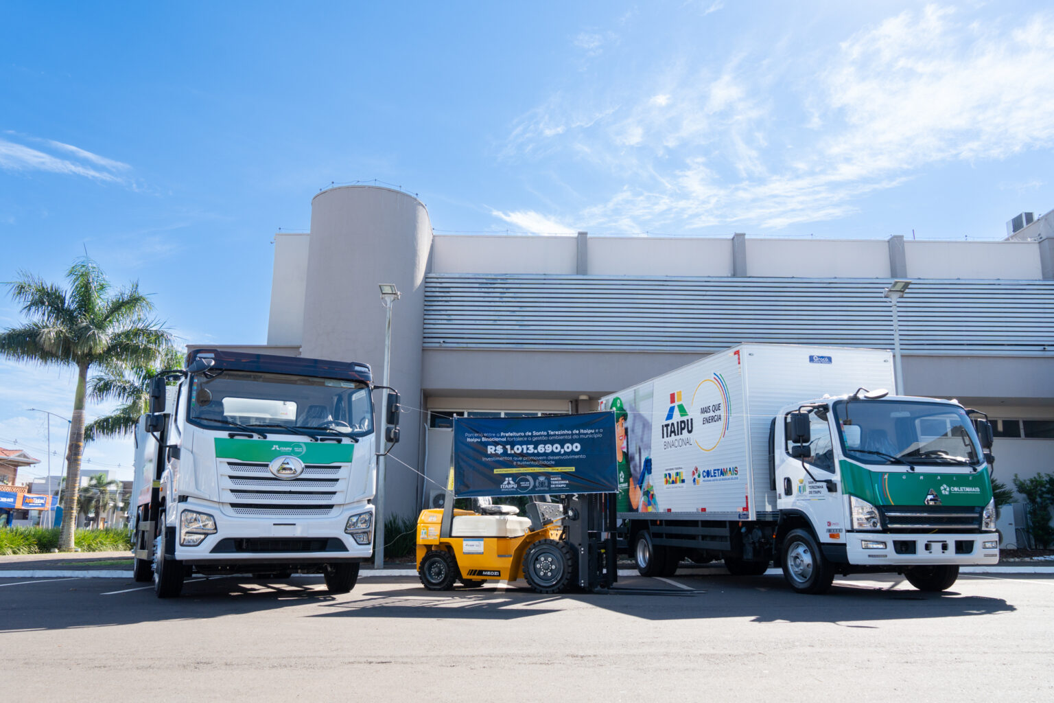 A Itaipu entregou, na manhã de terça-feira (27), dois caminhões e uma empilhadeira para a Associação dos Catadores de Resíduos Recicláveis e/ou Reaproveitáveis de Santa Terezinha de Itaipu (Acaresti). O investimento, de mais de R$ 1 milhão, com contrapartida do Município, acontece por meio do Programa Coleta Mais, vinculado ao Itaipu Mais que Energia, voltado a melhorar a qualidade de trabalho e vida de catadores e catadoras do PR e MS.