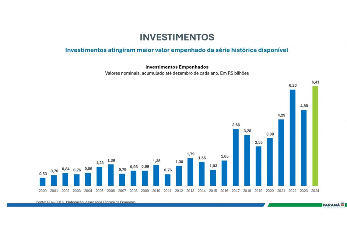 Os números apontam uma tendência de alta. O ano de 2024 foi o que o Governo do Paraná mais investiu em toda a sua história. O Estado aplicou R$ 6,41 bilhões, o maior valor de toda a série, iniciada em 2000, segundo dados da Secretaria de Estado da Fazenda (Sefa). O valor é 64,3% superior ao que a própria pasta havia projetado para o ano.