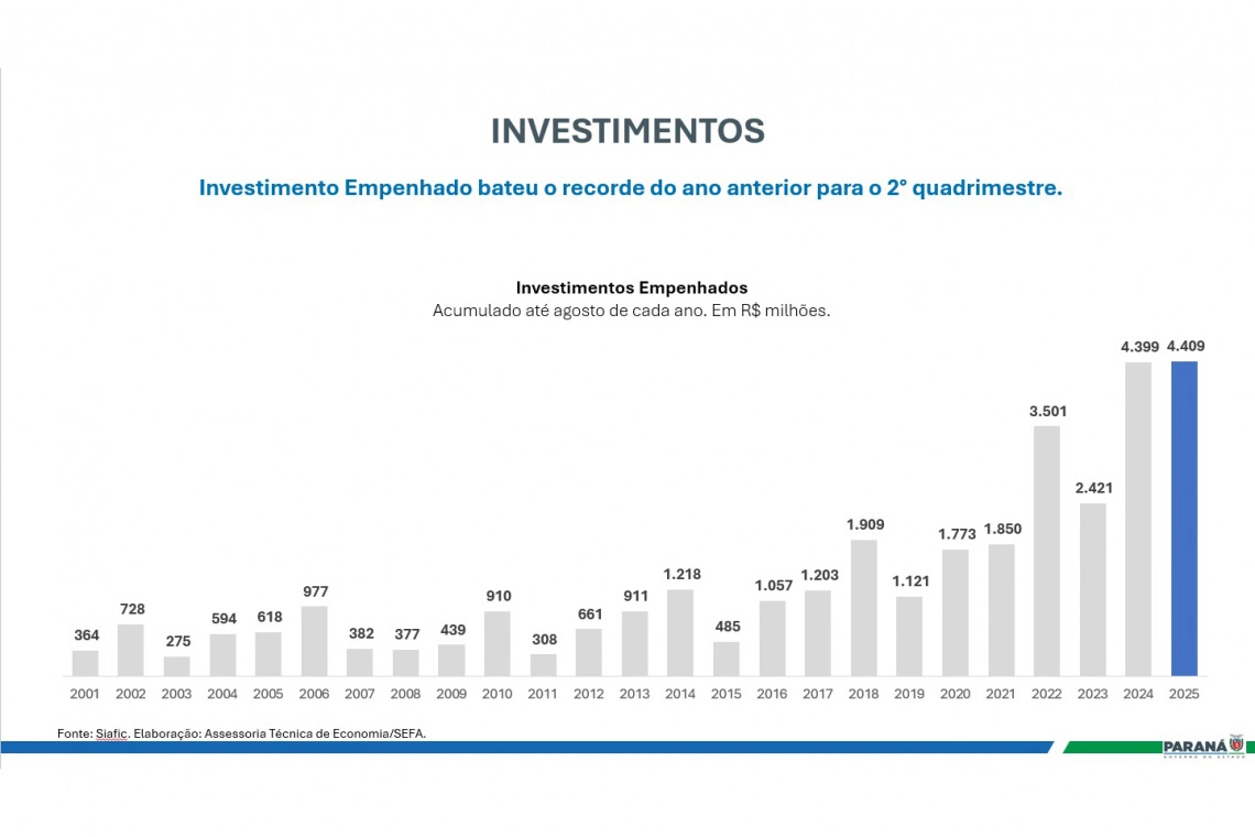 Os bons números paranaenses não se limitam apenas aos investimentos liquidados. O valor empenhado pelo Estado também quebrou recorde, atingindo o patamar inédito de R$ 4,4 bilhões entre janeiro e agosto de 2025, o maior de toda a sua história para esse período. Os empenhos correspondem à reserva de dinheiro do orçamento destinada para o pagamento de bens e serviços contratados.