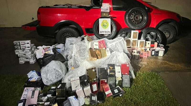 Durante o patrulhamento, os agentes abordaram um veículo modelo Saveiro, ocupado por um homem de 42 anos e uma mulher de 40 anos. Após a revista ao carro, foram encontrados diversos produtos oriundos do Paraguai sem o devido desembaraço aduaneiro. Entre as mercadorias apreendidas estavam pneus, eletrônicos e itens de perfumaria.