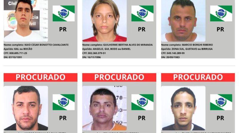 No Paraná, seis nomes figuram entre os mais procurados do Brasil. Eles têm ligação com facções criminosas, crimes violentos e ações de grande impacto. Um dos alvos é Kaio Cesar Bonotto Cavalcante, o Kal ou Bocão, de 34 anos. Ele é suspeito de participar da invasão ao prédio da empresa de valores Prosegur, no Paraguai, em 2017. A ação, com uso de armas de guerra, causou prejuízo estimado em R$ 120 milhões.
