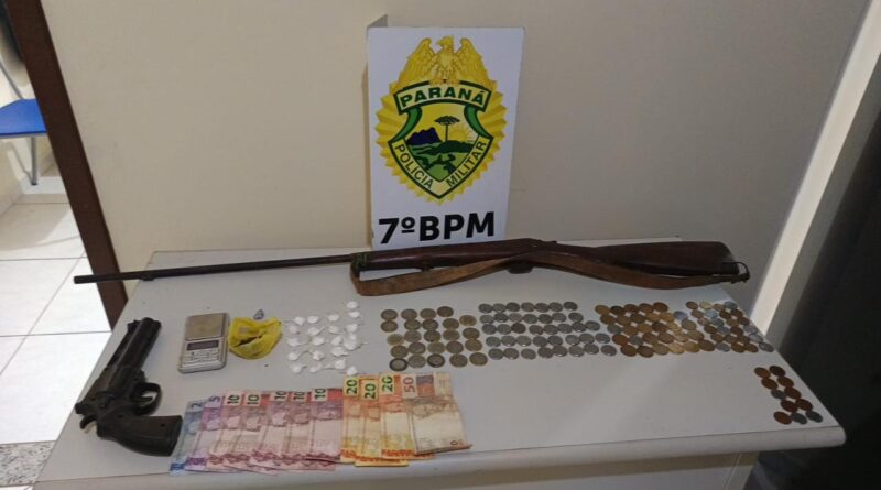 Segundo o boletim da Polícia Militar, durante o patrulhamento foram apreendidos 6,3 gramas de maconha, 21 buchas de cocaína (totalizando 11,6 gramas), uma balança de precisão, papel alumínio, R$ 218,20 em dinheiro trocado, quatro celulares, além de um simulacro de revólver e uma espingarda artesanal.