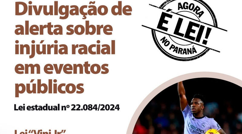 A Lei Vini Jr. (Lei 22.084/2024), de autoria do deputado estadual Anibelli Neto (MDB), foi sancionada pelo governador e agora está em vigor no Paraná. A legislação exige a divulgação de alertas sobre injúria racial em eventos públicos com mais de 5.000 pessoas, abrangendo atividades esportivas, religiosas, artísticas e culturais.
