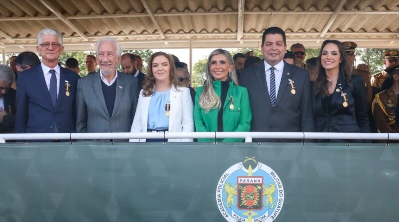 As deputadas Maria Victoria (PP) e Flávia Francischini (União), 2ª secretária e 1ª vice-presidente da Casa, respectivamente, e o deputado Gugu Bueno (PSD), 1º secretário do Poder Legislativo, receberam nesta quinta-feira (15) a Medalha Coronel Sarmento, a mais alta honraria concedida pela Polícia Militar do Paraná (PMPR). A cerimônia aconteceu na Academia Policial Militar do Guatupê, em São José dos Pinhais, e contou com a presença do vice-governador Darci Piana (PSD); do comandante-geral da PMPR, coronel Jefferson Silva e da prefeita de São José dos Pinhais, Nina Singer (PSD) e de diversas autoridades.