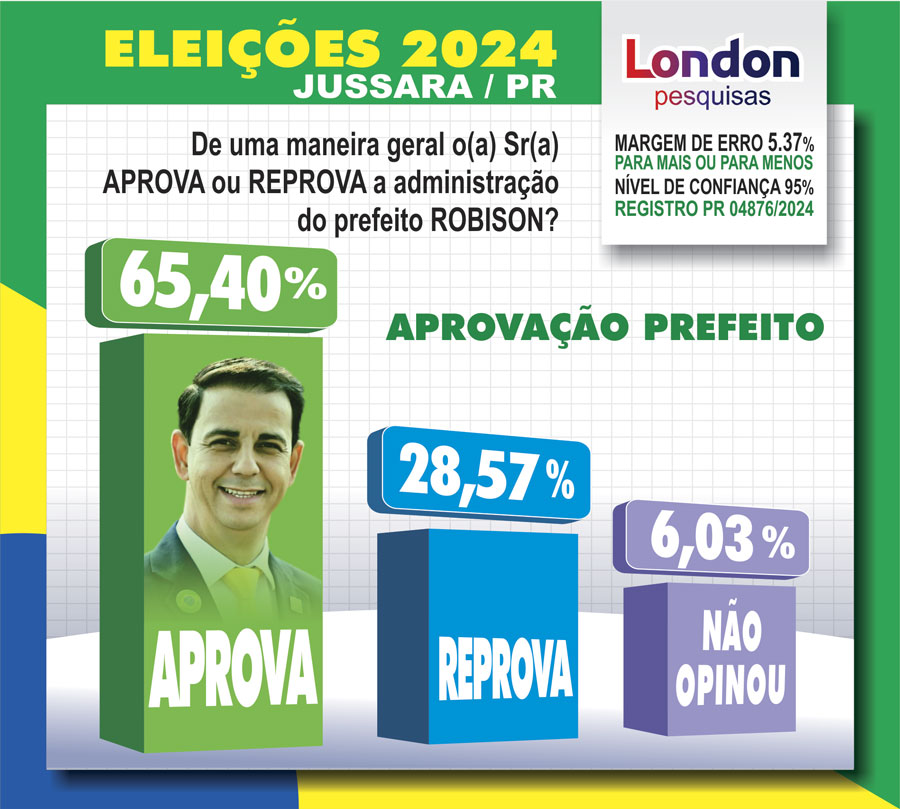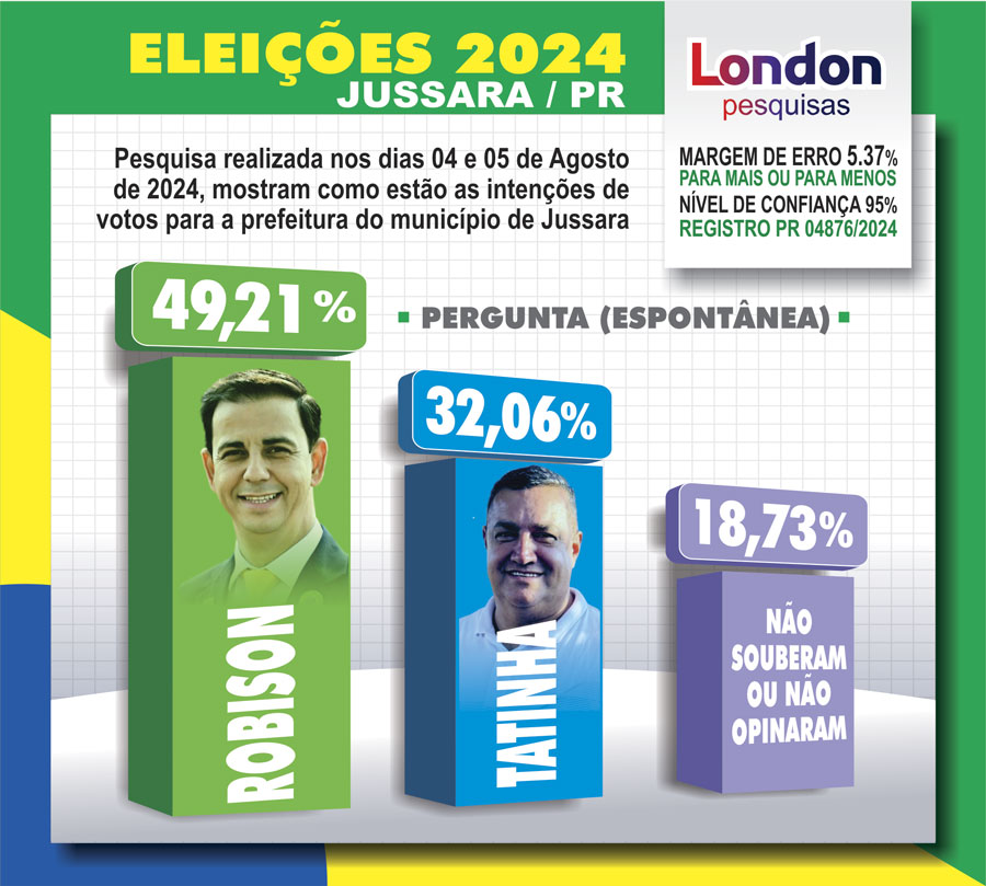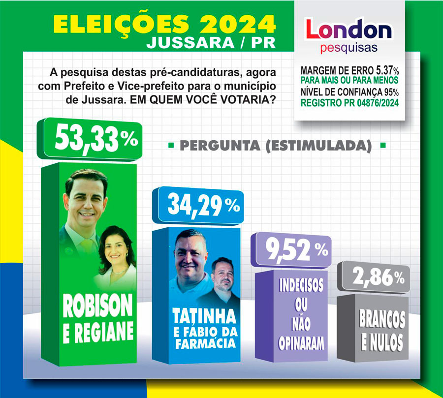 Uma pesquisa eleitoral recente, registrada no Tribunal Superior Eleitoral (TSE) sob o número PR-04876/2024, revela as intenções de voto para a prefeitura de Jussara nas eleições de 2024. A pesquisa foi encomendada pela TRIBUNA DE CIANORTE e conduzida pela empresa London Pesquisas entre os dias 4 e 5 de agosto de 2024, entrevistando 315 eleitores do município. A margem de erro é 5.37 e intervalo de confiança de 95%.