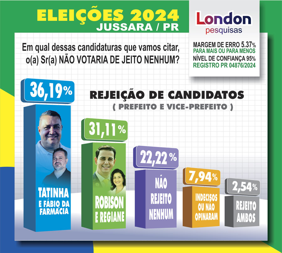 No quesito rejeição, Tatinha e seu vice Fábio da Farmácia foram rejeitados por 36,19% dos eleitores, enquanto 31,11% dos entrevistados declararam que não votariam de jeito nenhum em Robison e Regiane. Por outro lado, 23,23% afirmaram que não rejeitam nenhuma das chapas, 7,94% se mostraram indecisos e 2,54% rejeitam ambas as candidaturas.