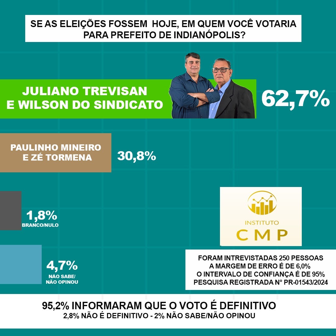 Uma pesquisa quantitativa realizada em Indianópolis revelou as intenções de voto para a eleição municipal de 2024. O levantamento, que ouviu 250 eleitores da cidade, mostra Juliano Trevisan e Wilson do Sindicato à frente na disputa, com 62,7% das intenções de voto. Paulinho Mineiro e Jé Tormena aparecem em segundo lugar, com 30,8%. Entre os entrevistados, 1,8% afirmaram que votariam em branco ou anulariam o voto, enquanto 4,7% não souberam ou preferiram não informar sua escolha.