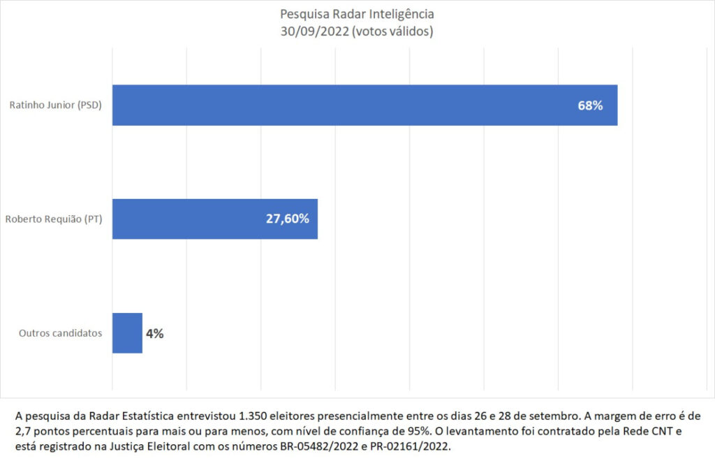 A pesquisa da Radar Estatística entrevistou 1.350 eleitores presencialmente entre os dias 26 e 28 de setembro. A margem de erro é de 2,7 pontos percentuais para mais ou para menos, com nível de confiança de 95%. O levantamento foi contratado pela Rede CNT e está registrado na Justiça Eleitoral com os números BR-05482/2022 e PR-02161/2022.