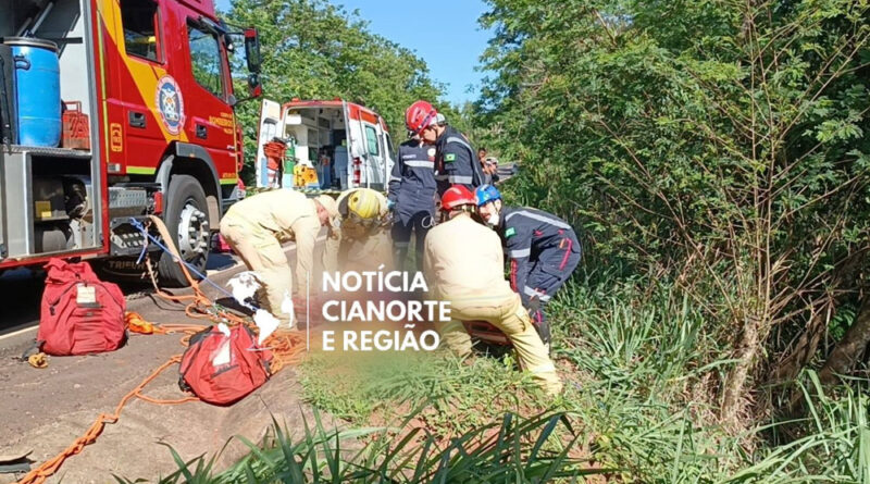 O resgate mobilizou três ambulâncias, duas do SAMU, básica e avançada, e uma do Siate, além do caminhão ABTR do Corpo de Bombeiros, devido à dificuldade de acesso ao veículo no local da queda.