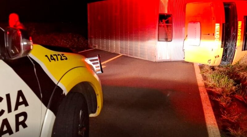 A ocorrência foi atendida por uma equipe da Polícia Rodoviária Estadual (PRE). De acordo com as informações, o caminhoneiro perdeu o controle da direção do veículo e tombou, obstruindo o tráfego na via.