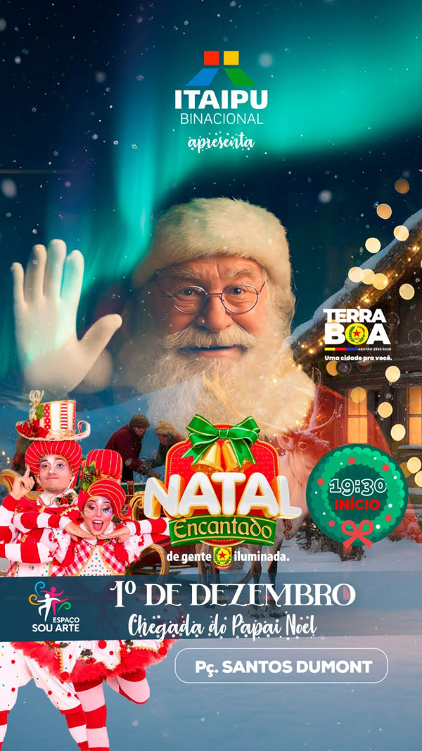 O clima natalino já começa a tomar conta de Terra Boa. A abertura oficial do “Natal Encantado de Gente Iluminada” acontece nesta segunda-feira, 1º, às 20h, na Praça Santos Dumont. O evento marca o início de uma programação especial preparada pela Prefeitura de Terra Boa, com apoio da Itaipu Binacional.