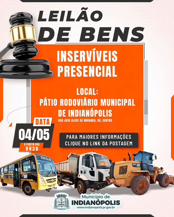 A Prefeitura de Indianópolis vai realizar, no dia 4 de maio, um leilão presencial de veículos, maquinários e outros bens pertencentes ao município. O certame será do tipo maior lance, com participação aberta ao público interessado.