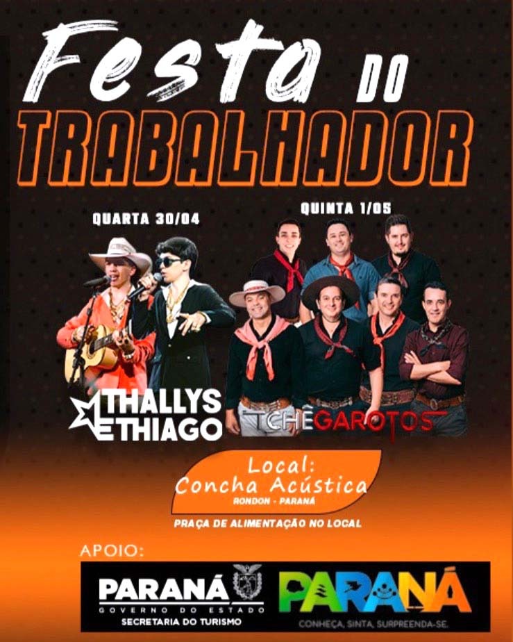Rondon dará início nesta quarta-feira, 30, a uma semana de festividades em homenagem ao Dia do Trabalhador. A celebração é promovida pela Prefeitura em parceria com a Secretaria de Turismo do Paraná e reúne atrações musicais, praça de alimentação e atividades abertas ao público.