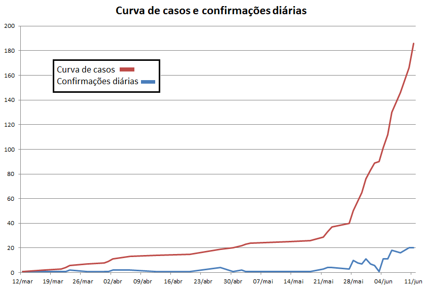 Em abril, um mês depois, também de acordo com o boletim epidemiológico do órgão, passou para 738 casos e 30 mortes. Alcançou 1.906 casos e 113 mortes no dia 12 de maio, até chegar aos números atuais, de 8.457 casos e 280 falecimentos.