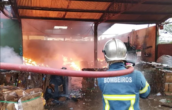 O incêndio começou por volta das 6h. Do lado de dentro, cerca de 40 toneladas de materiais recicláveis foram destruídas pelo fogo.